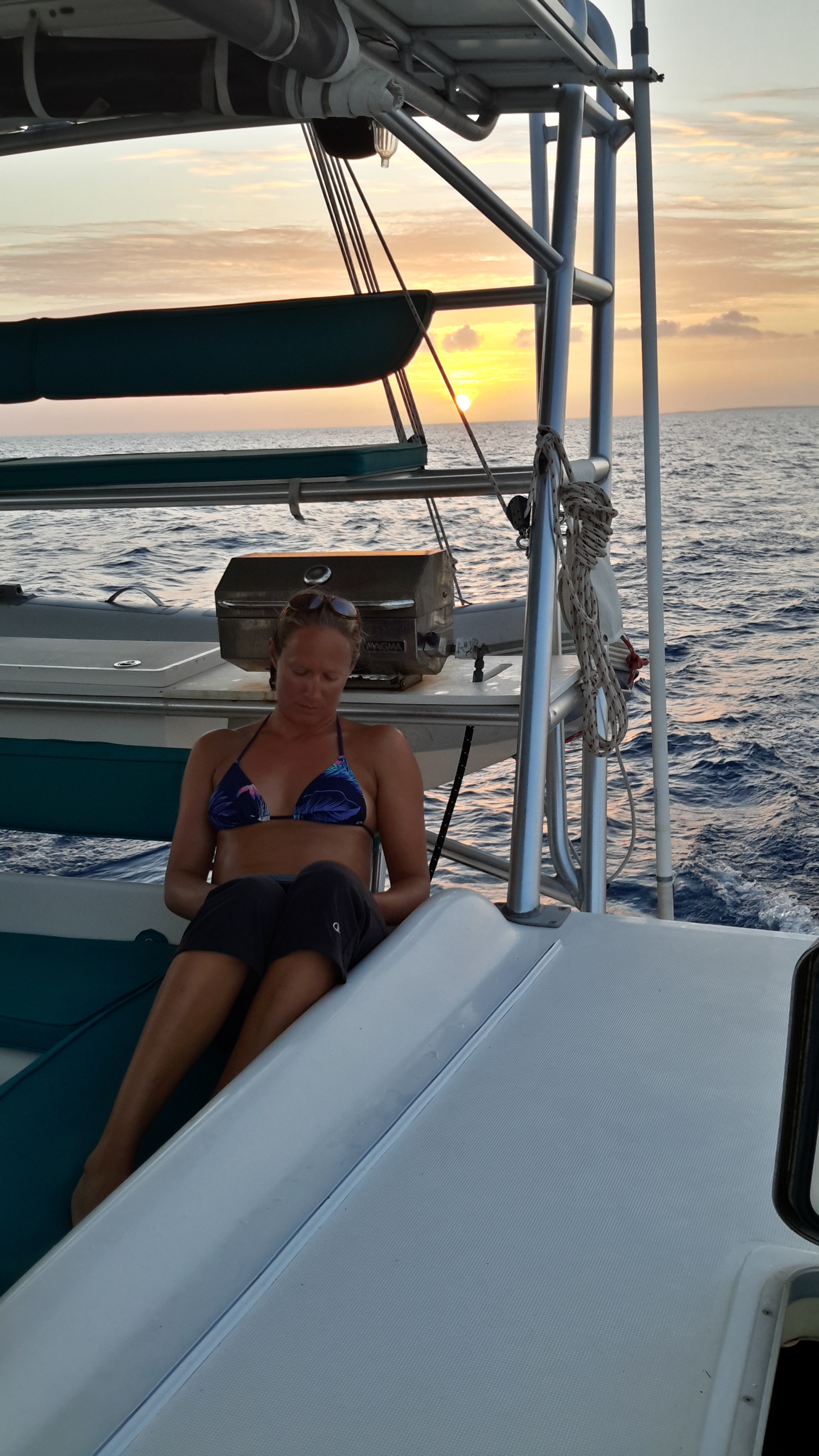 A big rain squall passed to the South of our route just at daybreak. I forget how peaceful and awe inspiring sunrise at sea on a small boat with little but water around you can be. The puffy cumulus clouds skirting along the horizon appear low enough that you could reach up and grab them. The palette of pastels and gray splashed across the sky give promise to a new and spectacular day. Your ass soon adjusts to the motion and rhythm of the boat through the water. Easier now since you can visually place a horizon with the movement. I may never truly like the jerky nature of the catamaran bounce over waves after years on monohulls, including one football shaped buoy tender. However, she is stable, high in the water, dry and spacious…all reasons we picked this boat over a number of others.